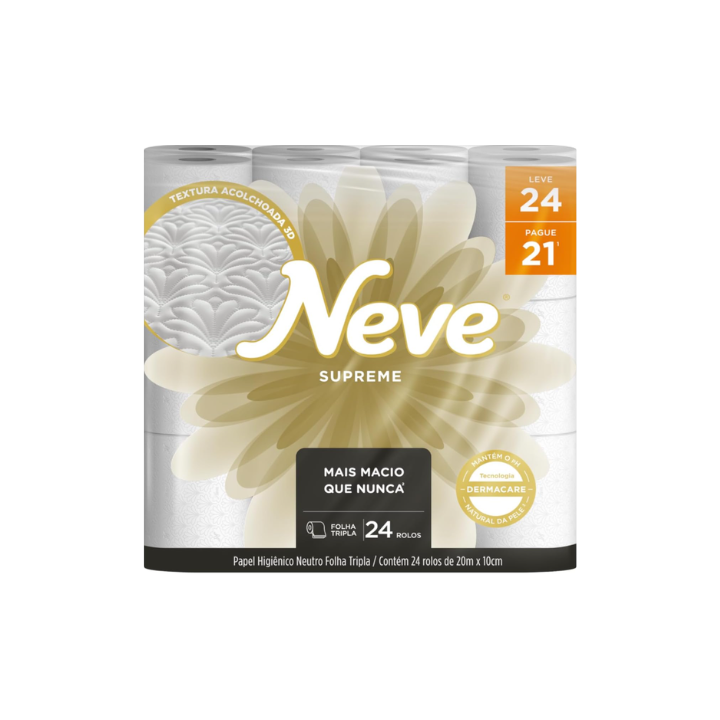Neve Papel Higiênico Supreme Folha Tripla, 20m, Leve 24 Pague 21 Rolos